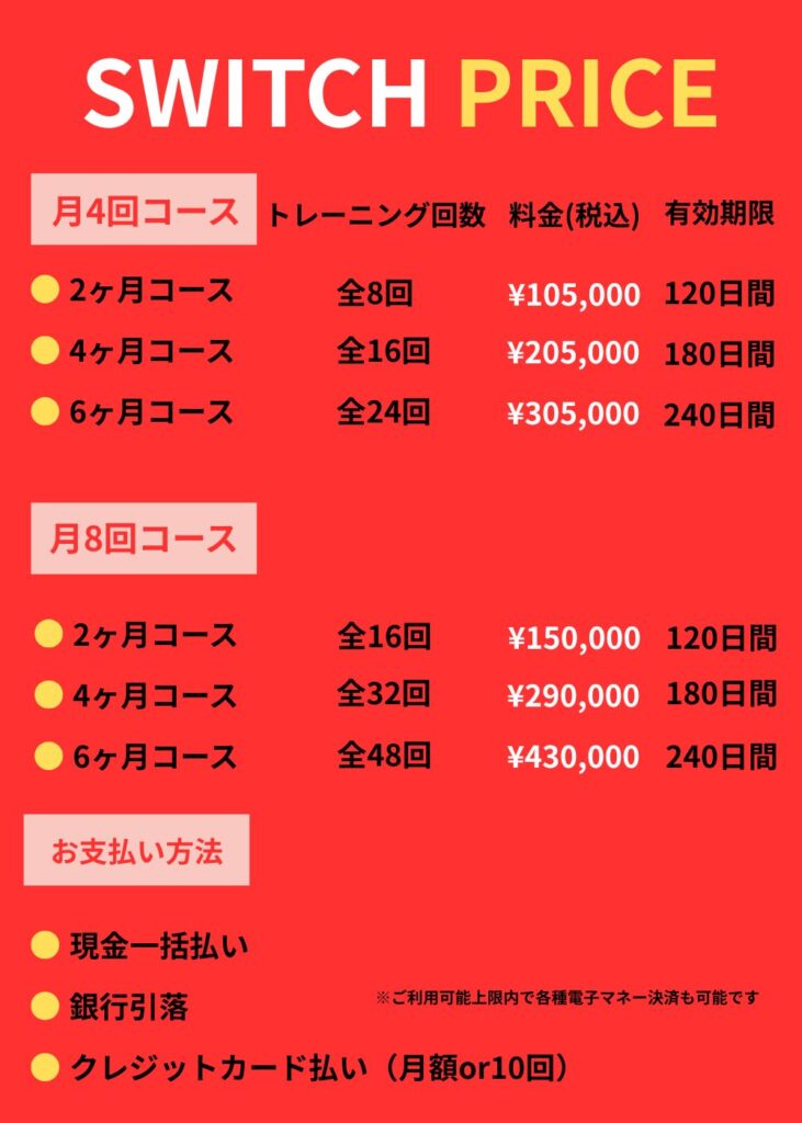 SWITCHでは、効率の良いトレーニングを提供するため90分システムを導入しています。